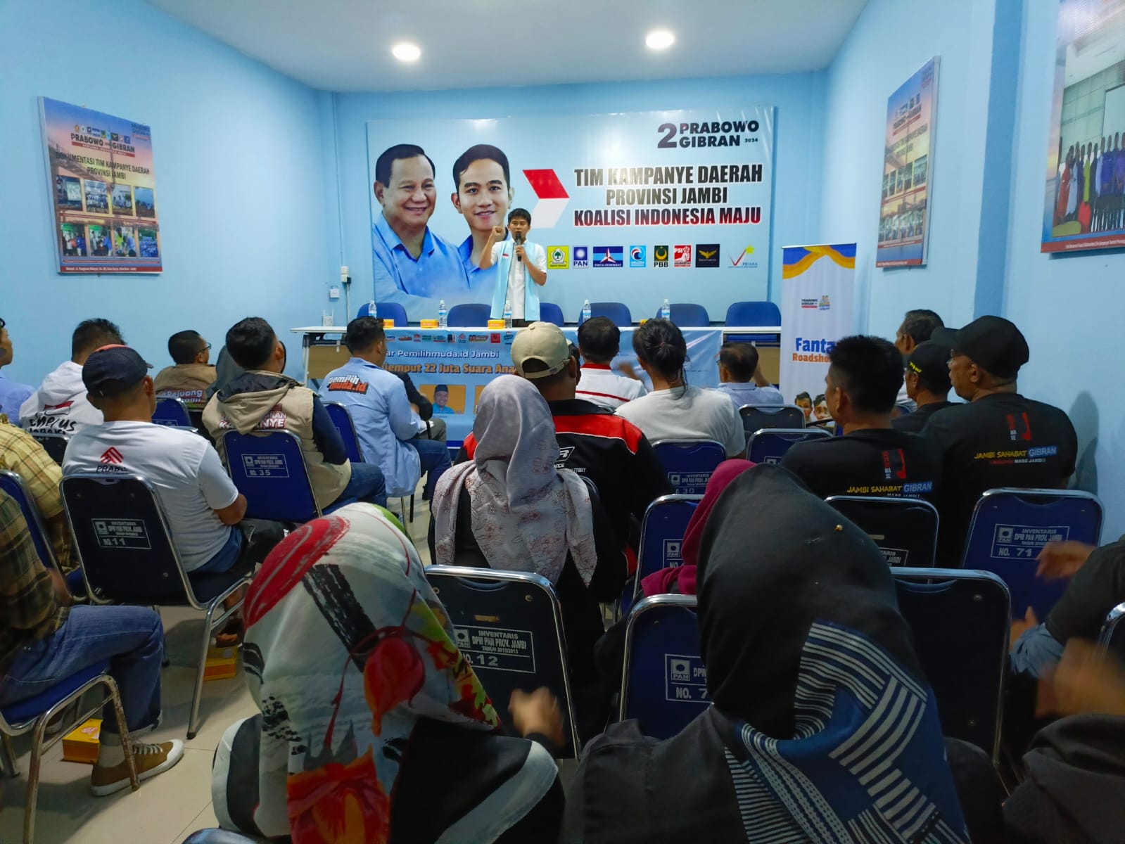 JAMBI – Road show Fanta Syariah Prabowo-Gibran menggelar kopdar pemilih pemula ‘Menjemput 22 Juta Suara Anak Muda Jambi’ di Sekretariat Tim Kampanye Daerah (TKD) Prabowo-Gibran Provinsi Jambi, Jumat (12/1/2024).