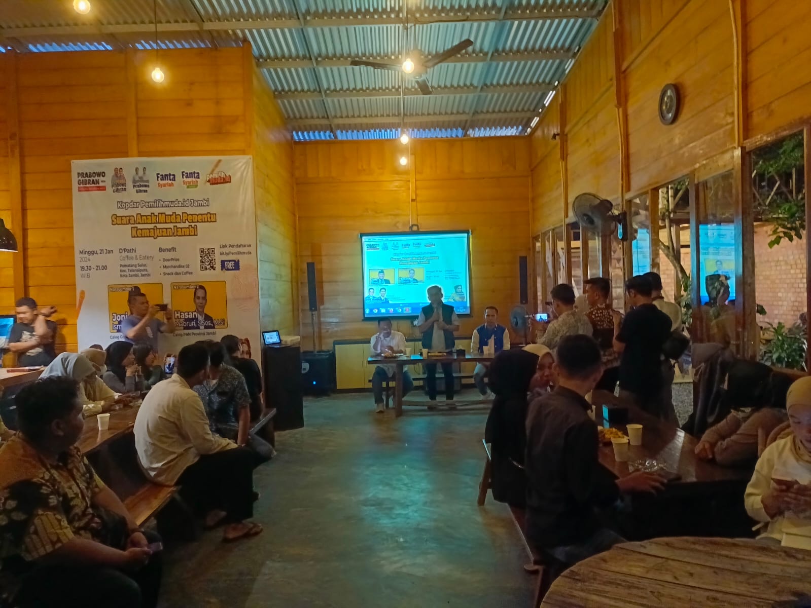 JAMBI – Relawan Fanta Syariah Prabowo-Gibran Provinsi Jambi menggelar Kopdar Pemilihmuda.id Jambi dengan tema ‘Suara Anak Muda Penentu Kemajuan Jambi’ di D’Pathi Coffe Kota Jambi, Minggu malam (21/1/2024).