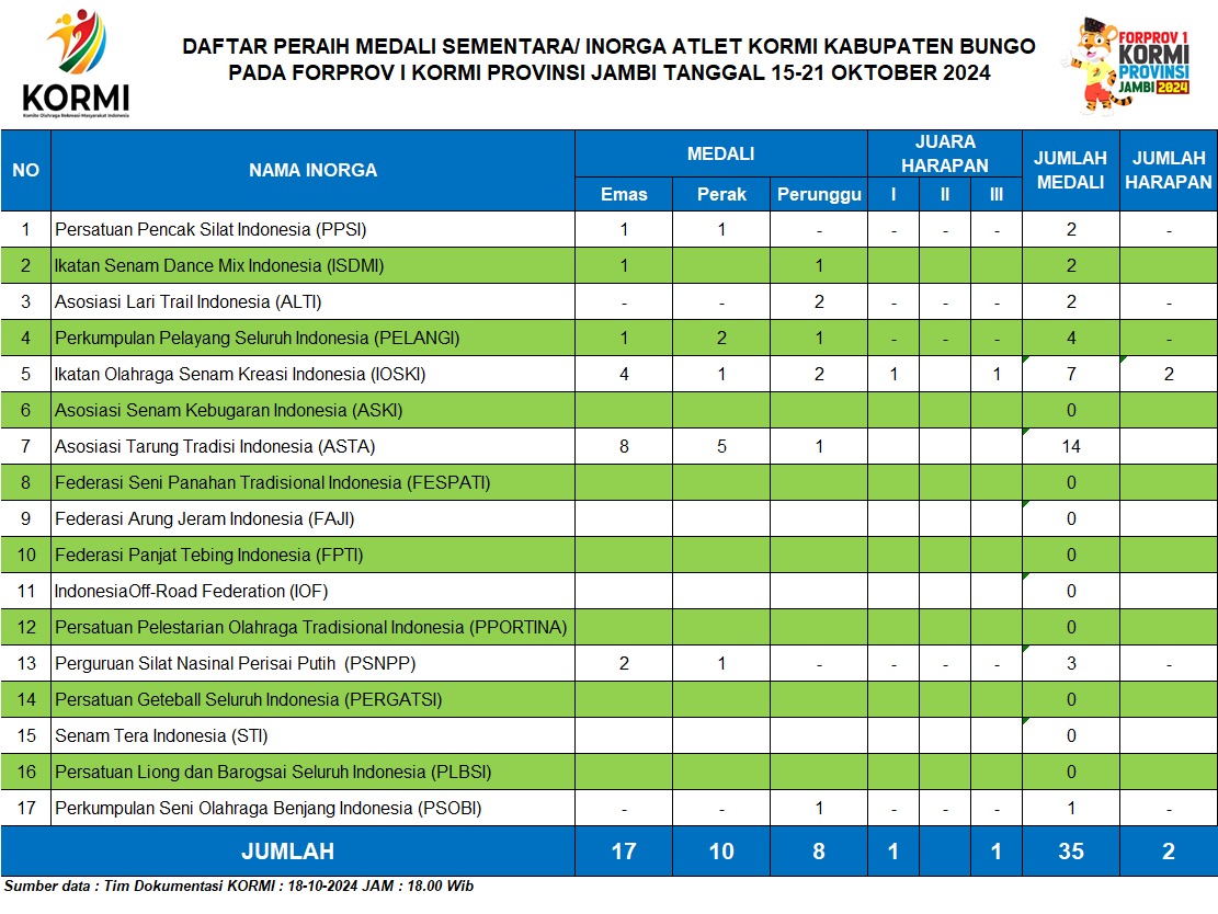 Berikut adalah tabel perolehan medali kontingen KORMI Bungo pada Forprov I KORMI Jambi. (***)
